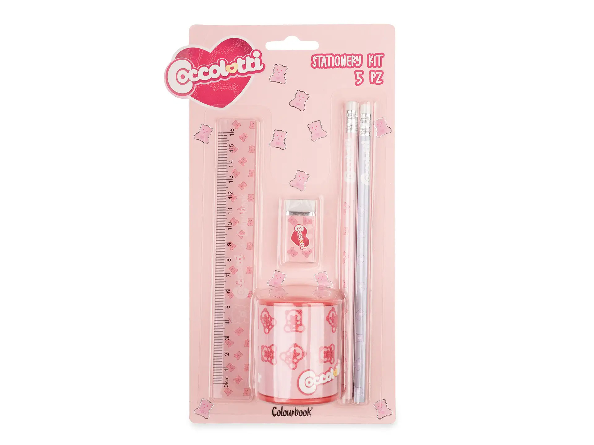 La linea Coccolotti by Colourbook presenta il nuovissimo set composto da due matite con gomma HB, gomma da cancellare, righello da 16 cm e temperamatite a due fori con serbatoio.